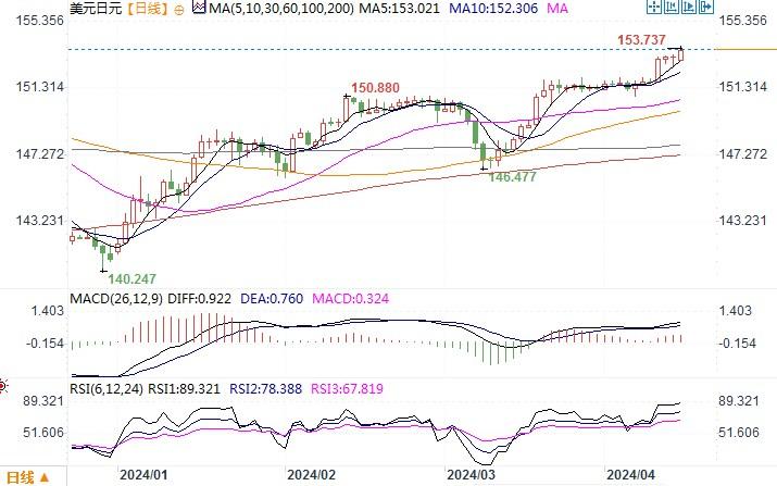 周五(4月12日),美元指数盘尾上涨0.7%,报106.02,美元兑日元纽约盘尾报153.19,微微下跌0.1%,稍早曾升至1990年中期以来最高的153.39。地缘政治风险增加、美国通胀方面的鹰派数据以及此前强劲的就业报告,推动美元指数上周创下2022年9月以来的最大周线百分比涨幅。与此同时,在欧洲央行暗示可能很快降息后,欧元兑美元跌至五个月最低,亦刺激美元兑非美货币的全面走升。当前,联邦基金利率期货市场也将对今年降息次数的预期从几周前的大约三或四次减少到不到两次,累计降息幅度预计为约46个基点。利率差的进一步拉宽,使得美债更具吸引力,持之不懈的趋利交易将会使日元备受压力。尽管周五日本官员发声威胁将会干预汇市,曾一度限制了日元的跌势,但只要日本当局未进行任何实际的市场干预行动,预料日元将仍会遭到空头的进一步狙击。日线图上,美元/日元继续紧贴布林带通道上轨线,技术指标呈上摆,未出现顶背离迹象,显示美元多头仍旧占据主动,进一步上行目标将有可能瞄向155。短线还是要警惕日本当局入市实施交易上的干预风险。