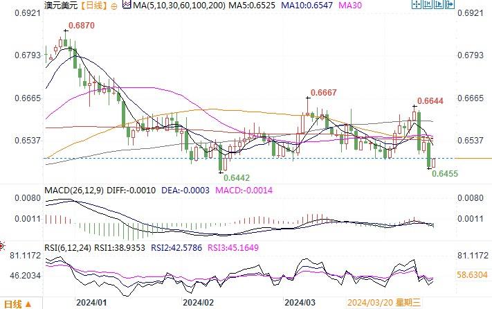 周五(4月12日),中东方面伊朗大规模报复性袭击以色列令地缘冲突急剧升级,美元受避险买盘热捧加速上升,导致澳元出现1.1%跌幅,收盘低落至0.6463。尽管澳联储被预期有望在11月份之后才会采取行动进入降息,但禁不住美元近期强势表现的光芒遮盖,澳元/美元也是自0.66附近出现了大幅的回撤。日线图上,澳元/美元再度抵近布林带通道下轨线,且逼近此前横盘区间的底部附近,一旦年内低点支撑0.6442下破,澳元走软势头将变得明显。汇价只有回到0.6560之上,或才有望缓解下跌的势头。