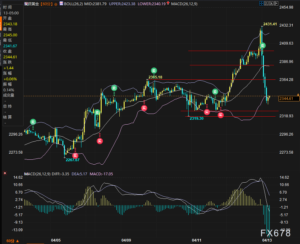而周末伊朗对以色列进行了报复行动,新的一周,周一(4月15日)亚市盘初,截止06:15,黄金一度反弹2372美元美元/盎司附近,但估计2400美元/盎司关口将充当重要阻力,在此之前的2382将充当一定阻力,若有幸突破2400则关注历史新高2431。下方支撑看2330-2320区域,若跌破则关注2300。黄金可能需要先在2300-2450区间内整固才能有新的进展。