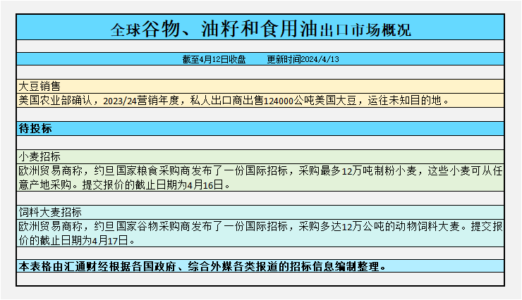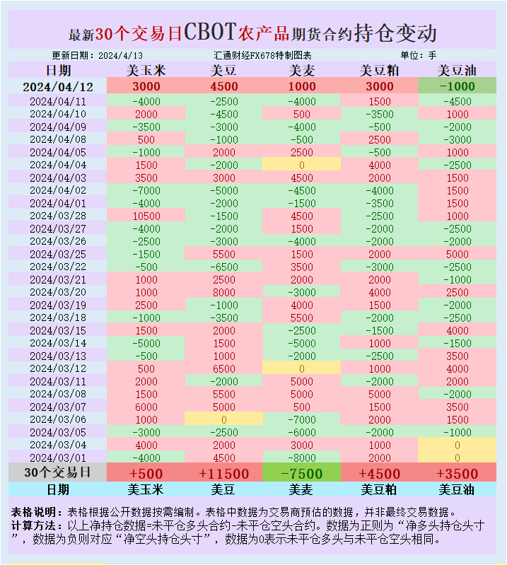 根据美国商品期货交易委员会(CFTC)周五公布的最新交易商持仓数据显示,截至4月9日当周,CBOT小麦投机者净空头仓位减少7351手头寸至109293手;CBOT玉米投机者净空头仓位减少2520手头寸至269611手;CBOT大豆投机者净空头仓位增加2719手头寸至159082手。
