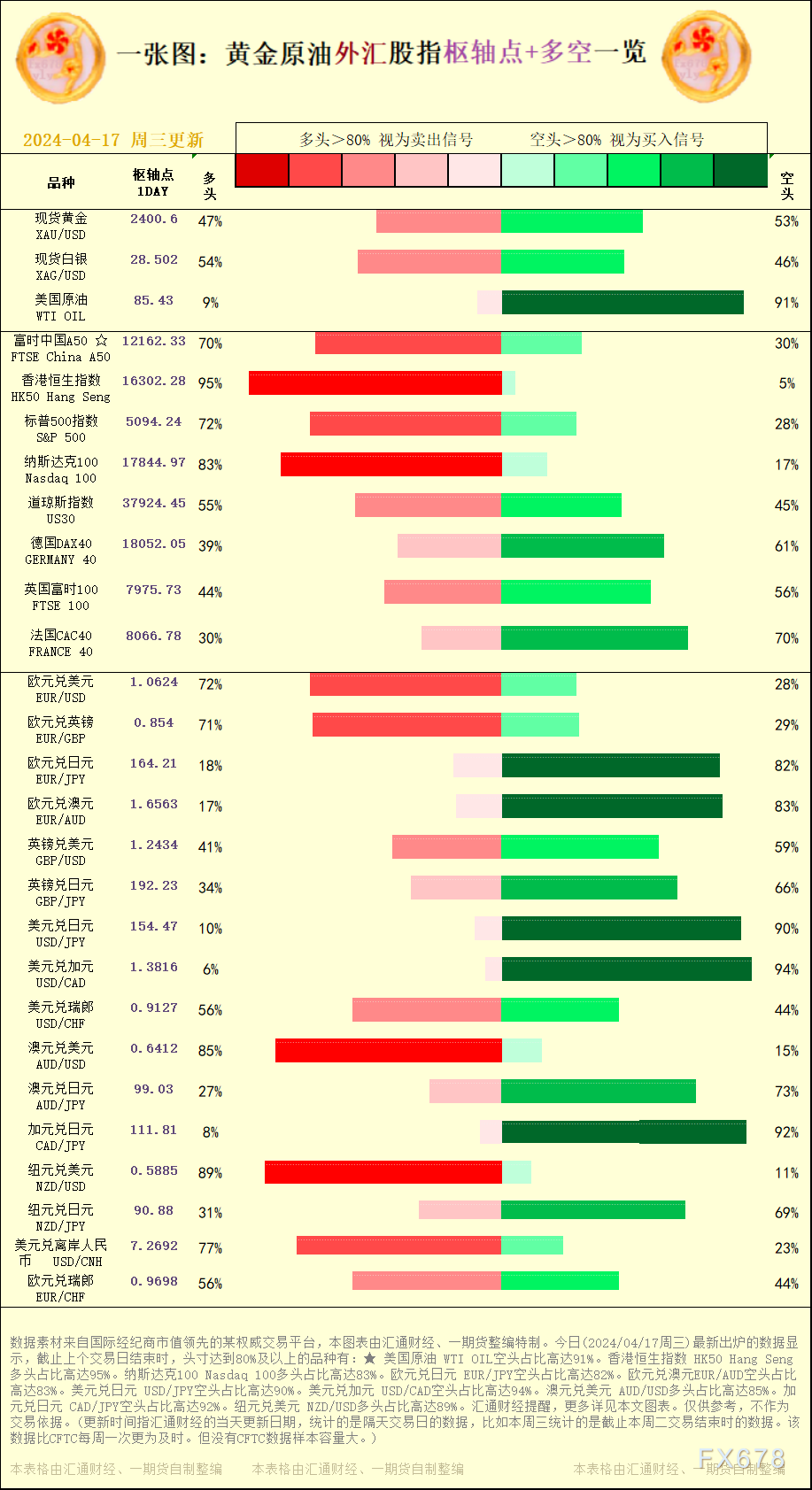 一张图:黄金原油外汇股指"枢纽点+多空占比"一览。今日(2024/04/17周三)最新出炉的数据显示,截止上个交易日结束时,头寸达到80%及以上的品种有:★ 美国原油 WTI OIL空头占比高达91%。香港恒生指数 HK50 Hang Seng多头占比高达95%。纳斯达克100 Nasdaq 100多头占比高达83%。欧元兑日元 EUR/JPY空头占比高达82%。欧元兑澳元EUR/AUD空头占比高达83%。美元兑日元 USD/JPY空头占比高达90%。美元兑加元 USD/CAD空头占比高达94%。澳元兑美元 AUD/USD多头占比高达85%。加元兑日元 CAD/JPY空头占比高达92%。纽元兑美元 NZD/USD多头占比高达89%。汇通财经提醒,更多详见本文图表。仅供参考,不作为交易依据。