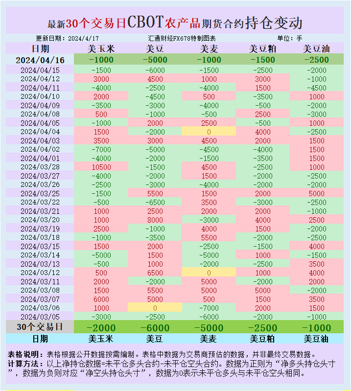 根据汇通财经观察,海外交易商估算的结果显示,本周二(4月16日),大宗商品基金增加CBOT美豆、美豆粕、美玉米、美麦、美豆油投机性净空头头寸。最新30个交易日,大宗商品基金增加美豆、美豆油、美豆粕、美玉米、美麦投机性净空头头寸。