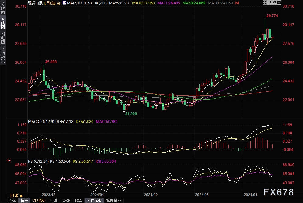 Valencia指出,白银的日线图显示,从技术角度来看,白银在触及年初至今高点29.79美元/盎司后,未能维持在心理价位29.00美元/盎司之上。这加剧银价跌向28.00美元/盎司关口的趋势,为白银进一步下跌打开大门。在过去的几天里,白银价格走势形成“乌云盖顶”,需要跌破4月15日低点27.59美元/盎司,以确认这一形态。