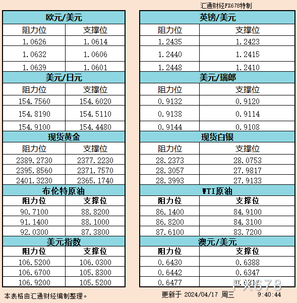本文提供美元指数、欧元、英镑、日元、瑞郎、澳元、加元及黄金、白银、原油支撑阻力位。