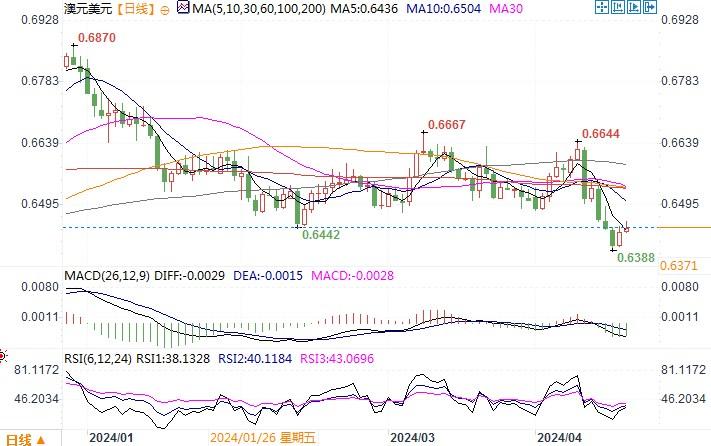 周三(4月17日),接着美元指数高位获利回吐之势,澳元兑美元略微自隔夜低点有所反弹,当日涨0.3%至0.6421。由于美国联邦储备理事会(美联储/FED)主席鲍威尔警告说,利率可能会在更长时间内维持在高位,交易员们怀疑澳洲央行将被迫今年可能根本不会降息。利率互换交易暗示12月首次降息的可能性为60%,这意味着年内即使降息一次也无法保证。与美元息差上不被拉大,或许能给到澳元些许的支撑。接下来是周四的澳洲就业数据。经济学家们预计,继2月的强劲表现之后,3月澳洲经济将新增1万个就业岗位,而失业率将上升至3.9%。若最终数据不佳,澳元难以从近期的下跌泥淖中拔出来。相反,若数据超好,则澳元有望进一步反弹。日线图上,短线看澳元/美元似乎在0.64年内低点附近受到一定的支撑,但整体弱势仍未有很好的改观,汇价只有从新回到0.6550之上,或许跌势才有望得以缓和,否则澳元继续下探低点的风险依然较大。