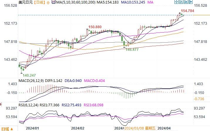 周三(4月17日),美元指数周三出现六日来的首次下跌报105.89,美元兑日元跌0.3%至154.32。此前,美国、日本和韩国的财政领导人在周三举行的首次三边会议上同意就外汇市场的动态进行“密切磋商”,承认了日韩对其货币近期大幅下跌的关切。市场参与者提高了日本当局可能干预支撑日元的门槛,从之前的152提到了现在的155,但他们相信日本可能随时出手。但他们还认为,只要日元的下跌是渐进的,而且是由基本面主导的,日本干预的可能性就很低。日本上一次干预汇市是在2022年,花费了约600亿美元来支撑日元。而就美元本身而言,在上周美国消费者物价热度高于预期之后,市场已将对美联储今年降息次数的预期降至两次以下。近期美联储主要官员更加鹰派的看法推动美国公债收益率上涨,这将继续吸引着资金流入美国。从日线图上上观察,美元/日元沿布林带通道上轨线保持上行态势,然在接近155当前的极限警戒水平之际,显得头部较重,技术指标虽未有改变走向痕迹,但短期皆进入超买区域,须得防范短线调整回落风险。整体上继续留意汇价破近155水平时日本当局有无干预的行动,若继续毫无作为,那么美元/日元将会继续冲高测试日本当局可容忍的极限水平到底在哪。