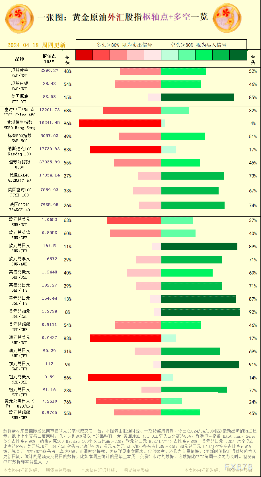 一张图:黄金原油外汇股指"枢纽点+多空占比"一览。今日(2024/04/18周四)最新出炉的数据显示,截止上个交易日结束时,头寸达到80%及以上的品种有:★ 美国原油 WTI OIL空头占比高达85%。香港恒生指数 HK50 Hang Seng多头占比高达96%。纳斯达克100 Nasdaq 100多头占比高达83%。欧元兑日元 EUR/JPY空头占比高达89%。美元兑日元 USD/JPY空头占比高达87%。美元兑加元 USD/CAD空头占比高达92%。澳元兑美元 AUD/USD多头占比高达83%。加元兑日元 CAD/JPY空头占比高达91%。纽元兑美元 NZD/USD多头占比高达86%。汇通财经提醒,更多详见本文图表。仅供参考,不作为交易依据。