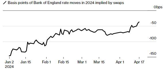英国央行的绑定 英国去年经历了七国集团中最严重的通货膨胀,但此后价格压力已经消退。这为降息打开了大门,而就在三个月前,降息还显得遥不可及。英国通胀数据公布后,货币市场削减押注