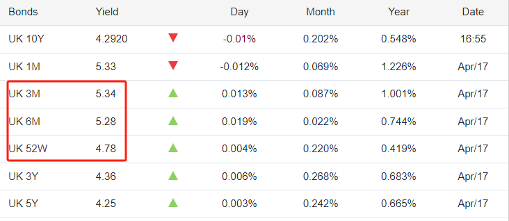 债券市场来看,英国3个月期国债收益率5.34%,高于六个月期的国债收益率5.28%,但两者的差距仅为0.06个百分点,无法排除偶然形成的可能。一年期英债收益率为4.78%,低于六个月期英债收益率约0.5个百分点,形成显著的长短期国债收益率倒挂。据此判断,英央行首次降息的临界点小概率是3个月之后,大概率是六个月之后,也就是今年10月份。