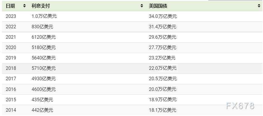 FXTM注册官网行情资讯美国国家债务膨胀,每100天增长1万亿美元,今年国债利息首次超过国防开支