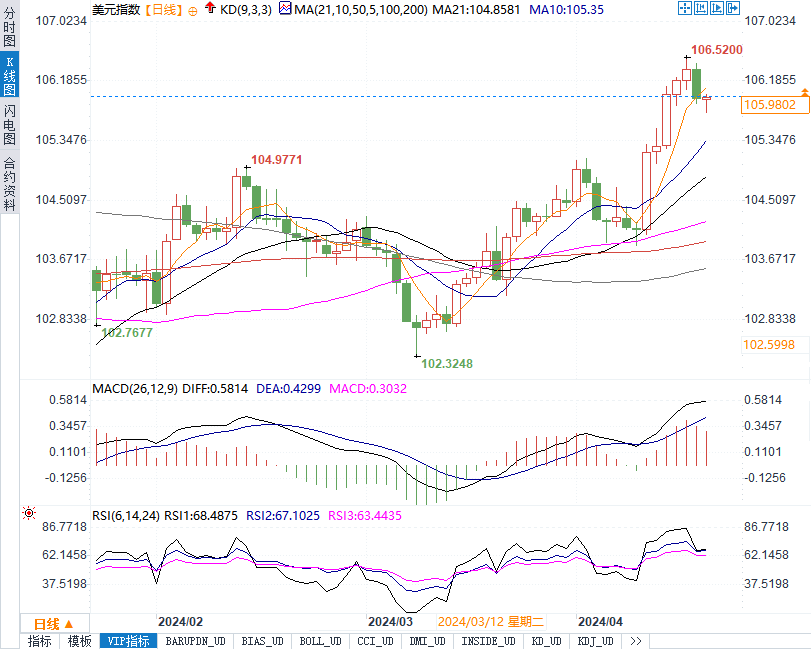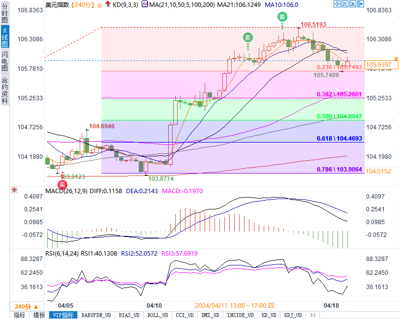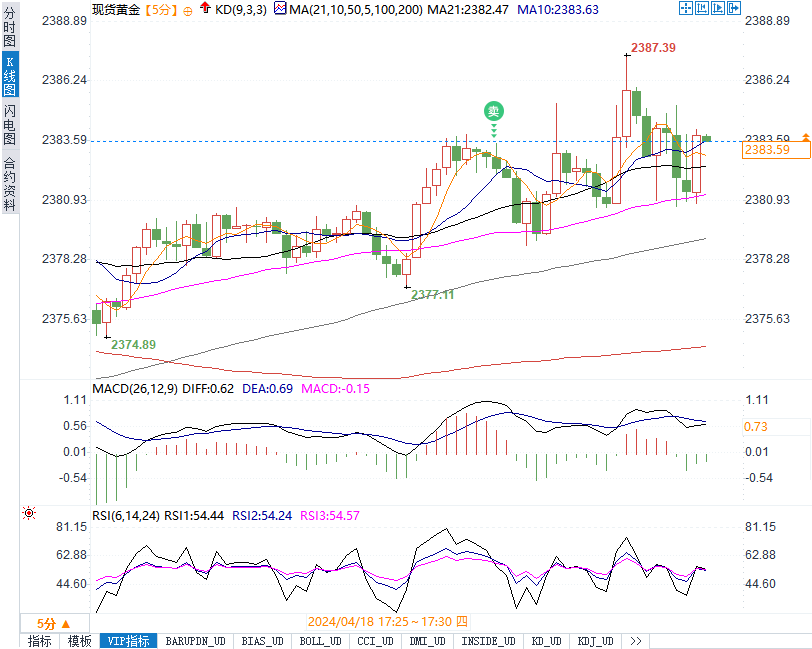 周四(4月18日)晚间,公布的美国初请失业金数据不及预期,现货黄金短线小幅走低5美元,现报2381.23美元/盎司。美元指数短线走高逾12点,最高触及106.0104的日高,现报105.9814。