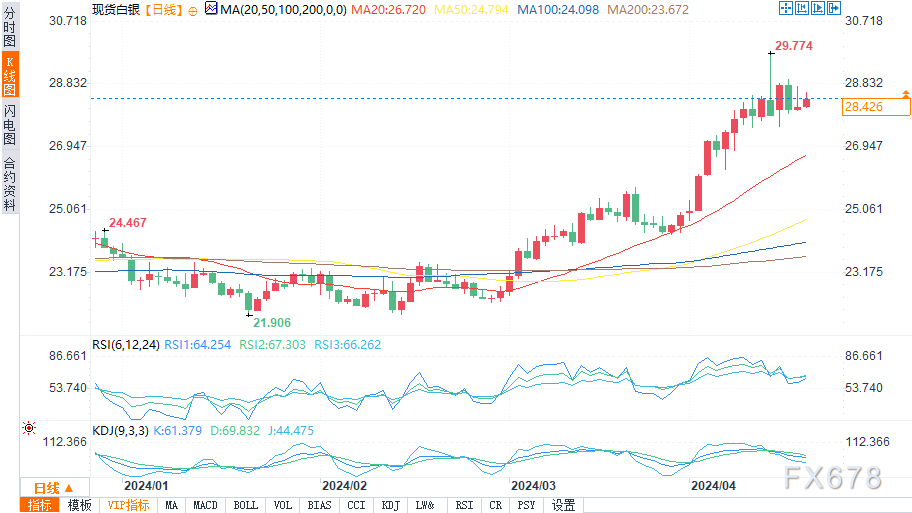 周四(4月18日),现货白银震荡上涨,盘中报28.547美元/盎司,涨幅1.26%。