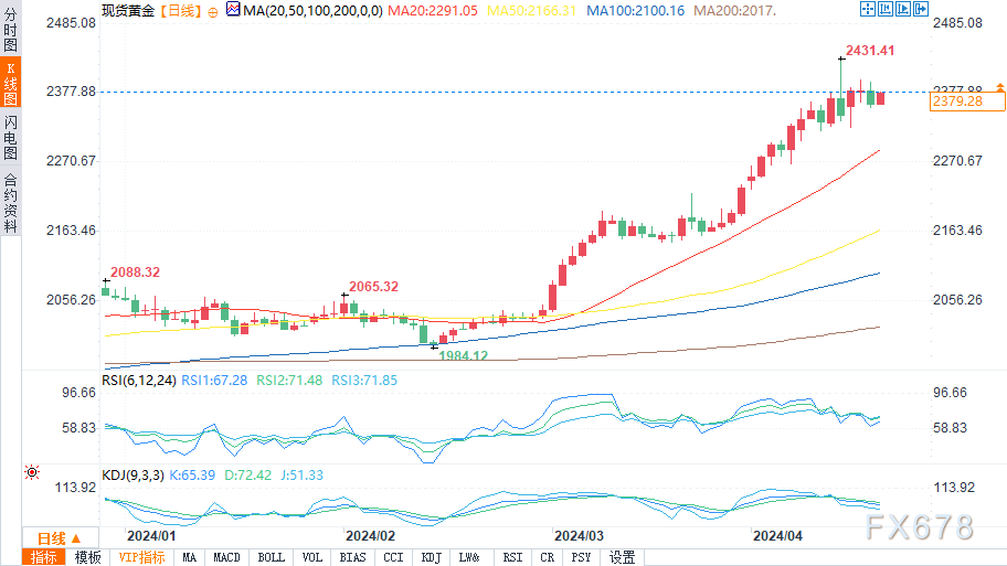 周四(4月18日)欧盘时段,现货黄金价格保上涨。盘中报2378.76美元/盎司,涨幅0.75%。