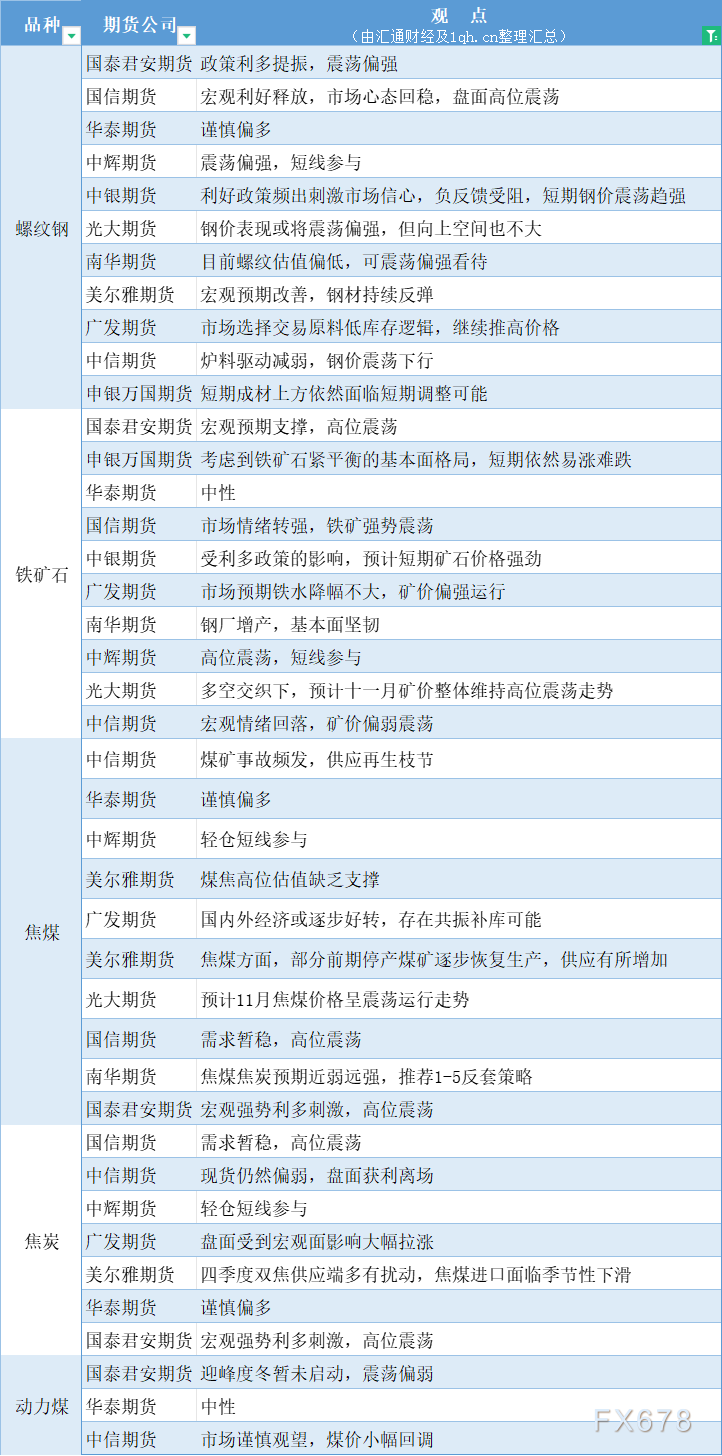 期货公司观点汇总一张图:10月30日黑色系(螺纹钢、焦煤、焦炭、铁矿石、动力煤等)