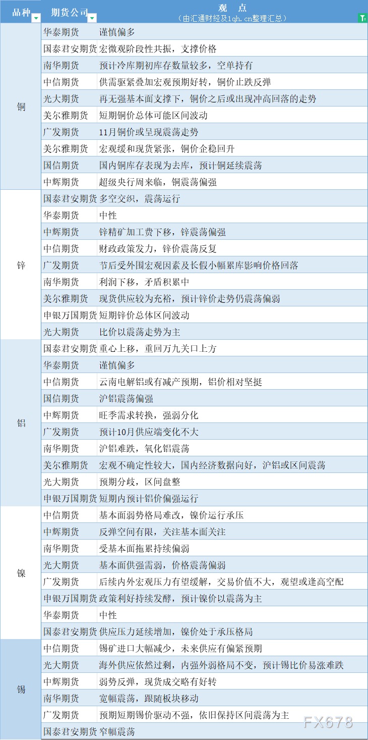 期货公司观点汇总一张图:10月30日有色系(铜、锌、铝、镍、锡等)