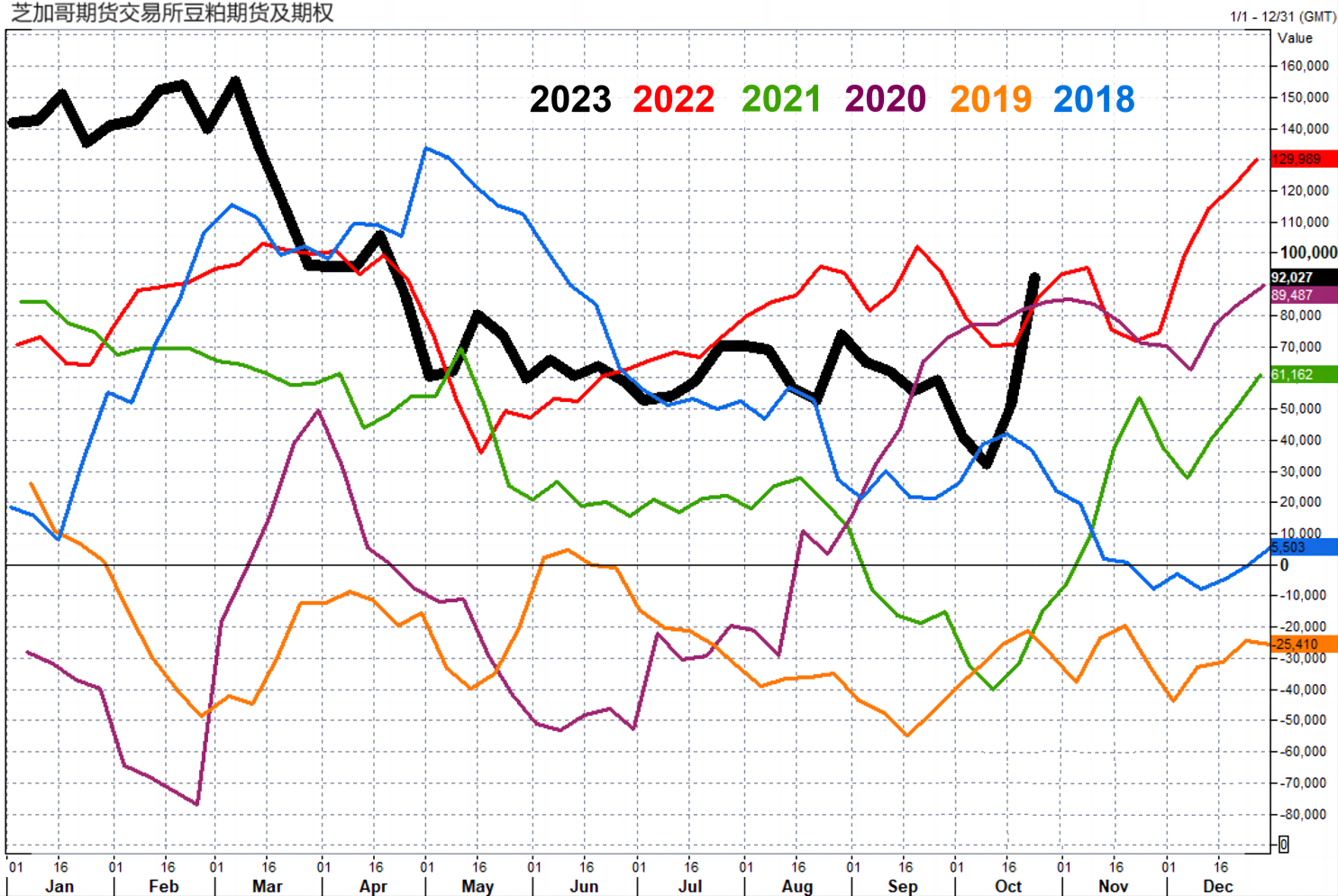 截至10月24日当周,基金经理将CBOT豆粕期货和期权净多头头寸从一周前的50698手头寸扩大至92027手头寸,对豆粕看涨情绪升至六个月来最高。