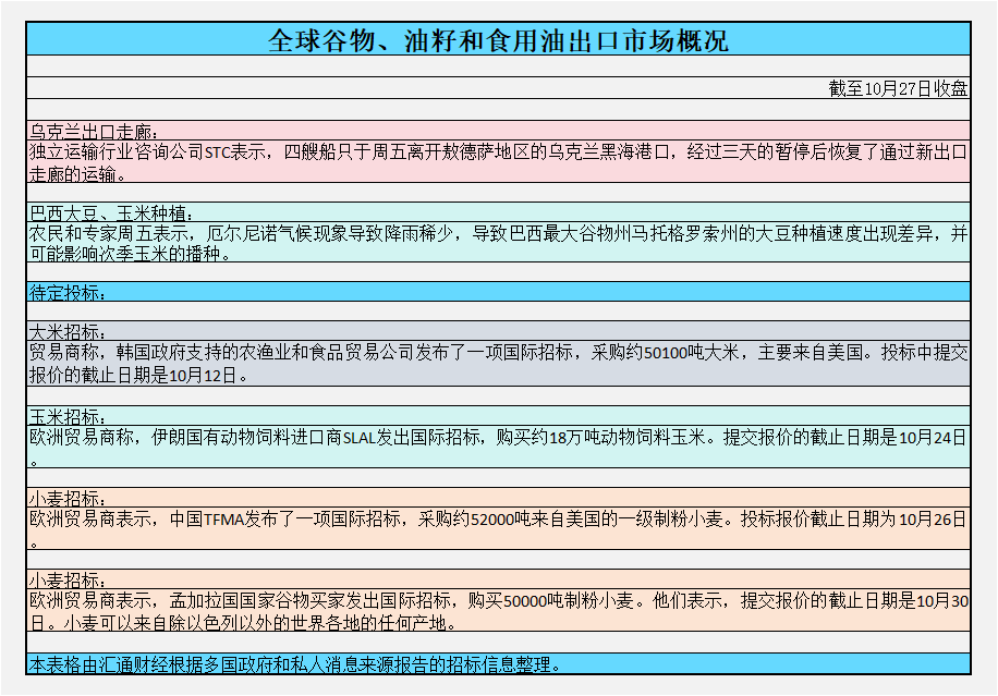 截至上周五(10月27日)收盘,多国政府和私人消息来源报告的全球谷物、油籽和食用油出口市场概况: