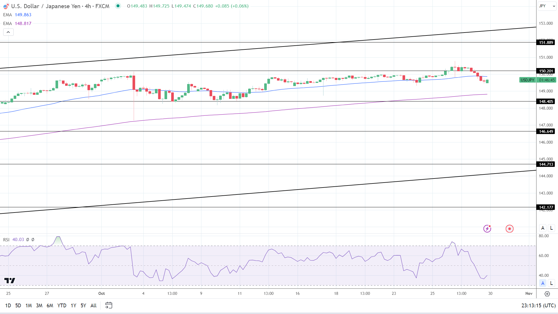 14周期4小时RSI为40.03,表明美元/日元在进入超卖区域之前跌破149关口。