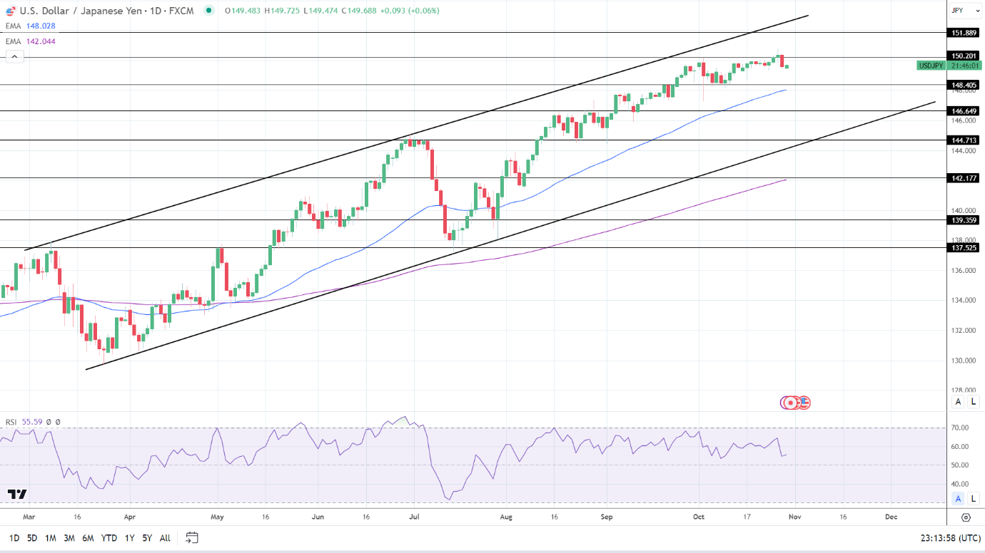 14天RSI为55.59,表明美元/日元突破150.201阻力位,然后进入超买区域。