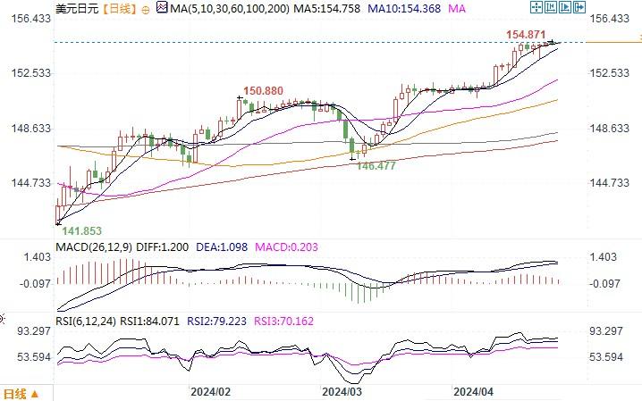 周二(4月23日),美元兑日元收盘价格基本与周一持平,收在近期高位154.82。虽然美元兑日元盘中曾高见154.88,创34年新高,并向155逼近,但由于市场人士认为该水平是日本干预的新触发点,因此接近该水平时,交易员还是保持着警惕,提防日本央行随时可能出现的干预。目前市场在等待本周日本央行的利率会议,当前市场的普遍意见认为日本央行很可能在周五按兵不动。现在关键的是在周四、周五两天会议前,日本央行会否有实际干预的行为出现。周二早些时候,日本财务大臣铃木俊一就干预的可能性发出了最强烈的警告,称上周与美国和韩国对口官员的会晤为东京采取行动阻止日元过度波动奠定了基础。因此,在美元/日元汇价逼近155这个被认为是新的干预触发水平的当下,还是要提高敏感性,防止日元因干预产生短期阵发性回升的风险。若本周日本央行利率会议既不加息也无实际干预行动,那么美元/日元恐终将会继续尝试冲击155的阻力。