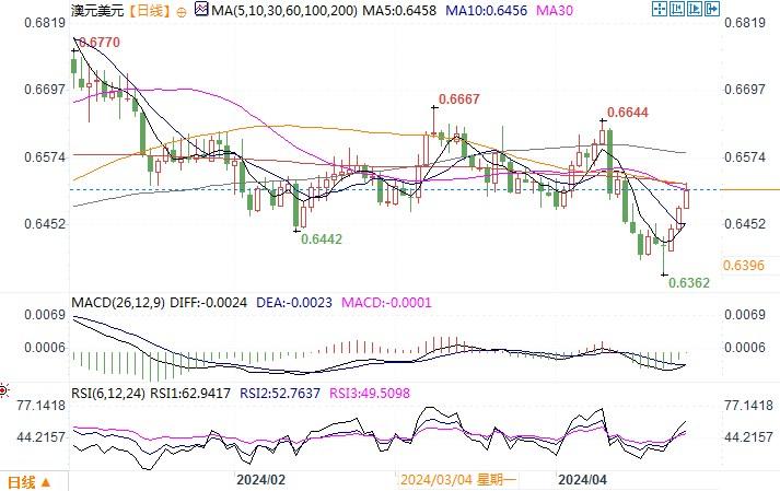 周二(4月23日),标普全球周二表示,其追踪制造业和服务业的美国4月综合采购经理人指数(PMI)初值从3月的52.1降至50.9,略高于荣枯分水岭,但已是4个月来最低水平。美元受数据的影响在外汇市场上略有下跌,澳元兑美元从中受益获得继续反弹上升的动能,收盘上涨0.62%报0.6485。随着对中东地区出现重大冲突升级的担忧有所缓解,交易商正将注意力重新转移到经济基本面上。对澳洲利率前景至关重要的是将于周三公布的季度通胀报告。分析师预计,澳洲第一季度消费者物价指数(CPI)环比升幅将从之前的0.6%上升至0.8%,但由于基数效应,CPI同比升幅可能降至3.5%,为两年来最低。如果通胀数据显示较强,则会令澳联储五月利率会议将会变得更加谨慎。在市场已经开始削减对全球范围的降息预期的当下,掉期交易预计澳洲央行今年总共只会降息18个基点,这意味着即使降息一次也无法保证。这种预期,有助于澳元在息差因素上保持一定优势。日线图上,澳元/美元在年内低位0.6360获得支撑后,展开了弱势反弹,但汇价整体走势仍受压于布林带通道中轨线之下,技术指标也未完全显示反转信号,显示澳元整体上的弱势尚未有得到逆转。只有向上突破0.6520,或才有望看到澳元/美元扭转颓势的希望。