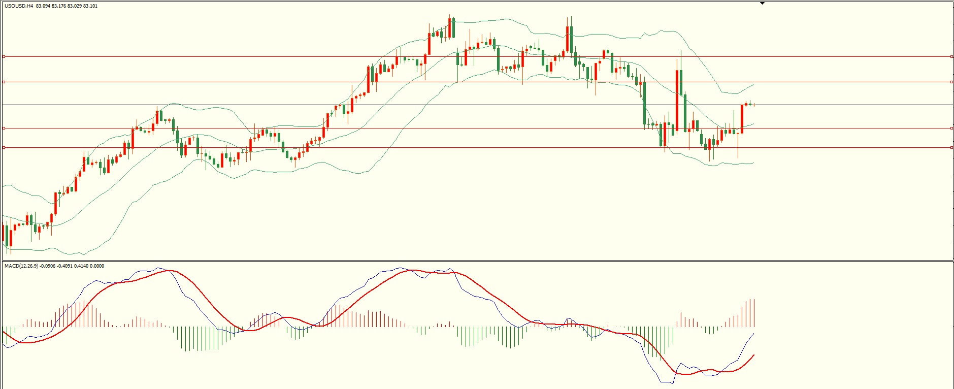原油昨日先抑后扬,盘中回落至前支撑展开反弹,日线报收下影线中阳线,前支撑犹存,日线回归震荡格局,从4H来看,布林中轨拐头向上,MACD零轴附近运行,日内下方首要支撑82.00-10,第二支撑81.20,上方阻力84.10-20,85.20-30,保持在第一支撑上方短线有望测试第一阻力。