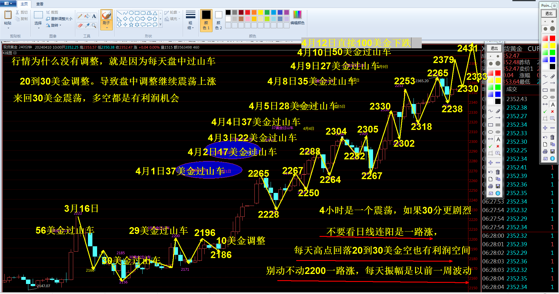 现在的行情千万不要谈技术和趋势,就是趋势多2417跌到2391又是116美金下跌,上周2431跌到2324也是100多美金下跌,两周遇到这样两次大幅度调整,就是上涨趋势,这样回落调整,你节奏不对或者重仓补仓也是随时消失市场,所以你就看盘面语言交易规律,多空争夺留下的痕迹就是交易的依据,上几周都是开盘价格上涨20到30美金空,现在都是开盘直接高开或者低开,一路不回头,等你反应是上涨下跌,反弹回落参与直接有多空变盘,幅度还是40美金特别大,多空变化也特别快,那么你就必须留意两个位置,一个是起涨点起跌点,其次就是反弹的空间,那么以昨天下跌反弹就是20美金开启震荡,那么今天也是20美金多空变盘,比如昨天2295反弹2315反复空,就是20美金幅度,突破2315那就是20美金涨基本在2335区域空,当然一样高位回落20美金也是反复多,这样进退自如,今日开盘价格2322那么你要参与空那就是2340参与,多就是2305参与,这样损8美金带好即可,如果激进昨天起跌点2334那么就是再次激进做空区域,那么昨日半夜美盘突破2315起涨突破点,那么就是激进做多2315到2310区域,这就是有理有据,同时我针对最近市场消息分析,什么黄金避险,中东动乱, 你去看看历史中东什么时候消停过,那几年没有动乱就是这两月就出来了,其实不然,就是品种补涨,你去看股指,数字货都是涨上天,随时调整风险,美元高利率持续不长久,必然引起资金去追捧下一个品种,什么都炒过了轮到黄金白银补涨仅此而已,然后又是什么货币争,取消美元化,你去看美元最近强势上涨,何来你说的取消,瘦死骆驼比马都是大不要去操这个心,再说黄金抗通胀,那三年前加息时候黄金也不是一直跌的,也是2080到1700震荡三年的,又是黄金保值,你天天震荡100美金来回震荡,何来稳健保值,搞不好自己站山顶就是几年,房价都是可以大跌,石油可以跌到负,就是资本炒作一走那都是一地鸡毛。如果你相信那么你就输了,现在宽幅震荡每天行情比一月盼一次非农都大,你要轻仓跟住节奏和规律走,不要幻想从头吃到尾,要中间即可,动不动涨了300美金,那两周出现100美金下跌,不也是200美金幅度空,试问这么大波动你利润多少,这么高位置你又敢重仓多少,我遇到一个人天天给我说1670多涨到2080不走,跌到1615多还在,现在拿到2400利润大赚,但是隔夜利息三年好像比利润都多,你说这样的中线有什么意义?无非就是吹吹而已,如果你相信一路1615多都是大赚,那么你可以退出市场了,永远记得你所看到的都是走过行情的回忆分析,如果进场买入都是利润,他为什么都是告诉你,如果都是进去利润,那么谁在亏,散户盈利银行亏,你觉得现实么,最后就是那些收购黄金和国内的零售商,买入黄金实物,但是零售高价没有人消费,都是没有流动资金,黄金何来一路上涨,你问你自己650一克黄金,你去买当饭吃不?如果不,为什么别人买,当没有人来买,供需不平衡自如下跌,这就是黄金除了货币属性还是一个商品,本轮上涨印度进口减少20%,同时俄罗斯取消黄金出口关税,这就是告诉你,人家开始抛售了,如果在这样上涨,石油黄金价格涨,那么俄罗斯有足够的财富出口,这个西方愿意看到么?那么乌克兰危机还有什么意义,慢慢品你就找到答案,涨到哪里不去猜,但是相对历史高位来回100美金震荡以后是常态!。