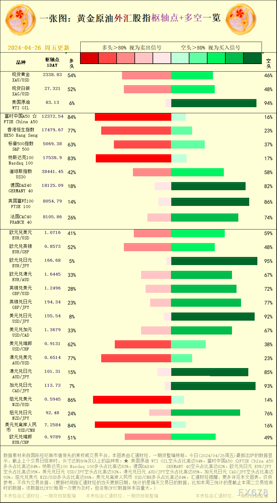 一张图:黄金原油外汇股指"枢纽点+多空占比"一览。今日(2024/04/26周五)最新出炉的数据显示,截止上个交易日结束时,头寸达到80%及以上的品种有:★ 美国原油 WTI OIL空头占比高达94%。富时中国A50 ☆FTSE China A50多头占比高达84%。纳斯达克100 Nasdaq 100多头占比高达83%。德国DAX40GERMANY 40空头占比高达82%。欧元兑日元 EUR/JPY空头占比高达95%。美元兑日元 USD/JPY空头占比高达92%。澳元兑日元 AUD/JPY空头占比高达85%。加元兑日元 CAD/JPY空头占比高达93%。纽元兑美元 NZD/USD多头占比高达86%。美元兑离岸人民币 USD/CNH多头占比高达84%。汇通财经提醒,更多详见本文图表。仅供参考,不作为交易依据。