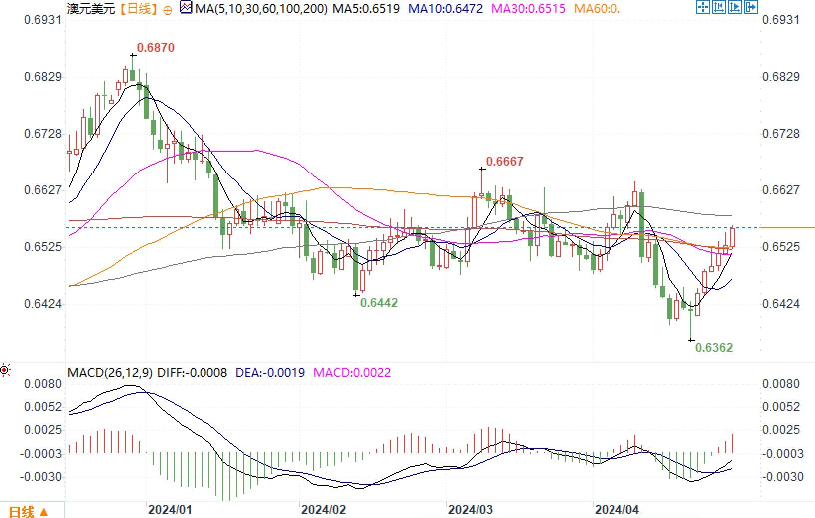 周五(4月26日),澳元兑美元周五勉力上涨0.23%,收盘于0.6533,盘中最高曾至0.6554水平。在交易员仍在消化澳洲第一季度通胀数据的影响之际(周三公布的该报告显示,澳洲第一季通胀放缓幅度不及预期,使得澳洲央行今年降息的希望破灭),日本央行周五一如市场预期,维持利率稳定,并表示可能会暂时保持宽松的货币条件,这刺激了澳元兑日元的套利交易应声创下九年新高,从中也是间接提升了澳元/美元的报价。此外,近期大众商品价格上涨,也是给到澳元反弹一定的支持力。日线图上,澳元/美元收于200日均线(0.6525)上方,技术指标MACD已形成金叉,具备进一步反弹看涨倾向。阻力位在12月至4月跌幅的38.2%回档位(0.6556)。突破0.6560后,目标将指向该走势的50%回档位(0.6616),初步支撑位在21日均线0.6505。