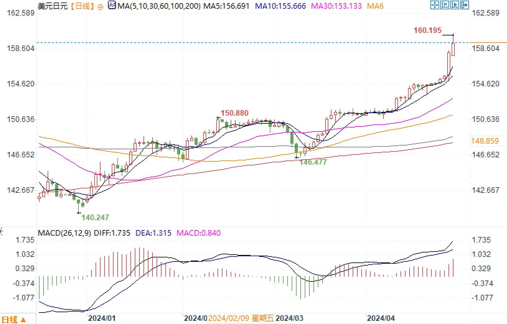 周五(4月26日),美元兑日元纽约盘尾上涨1.3%收盘于158.33,稍早曾创下158.43的1990年6月以来新高。日本央行在为期两天的政策会议结束时宣布维持利率不变,但暗示未来将加息。日本央行本次会议继续引发投机交易推低日元。此外,美国通胀数据没有显示出放缓迹象,3月个人消费支出(PCE)物价指数环比上升0.3%,符合预期,同比上升2.7%,预期为2.6%。PCE物价指数是美联储衡量是否实现其2%的目标而追踪的通胀指标之一。虽然周五的结果并不像大家传的那么热,但严峻的现实是,自2024年初以来,美联储青睐的通胀指标的短期趋势一直在稳步上行。由此引发市场确认了美联储可能推迟到今年晚些时候降息的预期,并预计美联储将在5月份的利率会议上会有鹰派的调子出现。当下的情形是,美国通胀具黏性、美日公债利差悬殊,日本通胀数据良性,日本央行周五鸽派按兵不动,日元将遭到继续削弱。但因为美元/日元涨势过快过猛,警惕日本央行下场实施实际交易性干预行动风险的出现。目前投机交易的上方目标预料瞄准着160水平,技术图形上布林带通道喇叭口扩张之中,技术指标均呈上摆之中,显示美元多头仍占主导地位。之前认为是警戒阻力水平的155将成为初步的支撑位置。