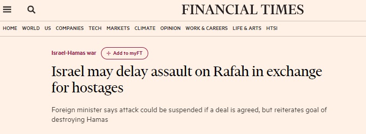英国《金融时报》最新报道称,以色列表示,如果能够达成一项确保以色列人质获释的协议,它愿意推迟计划已久的对哈马斯在加沙地带最后据点的袭击。