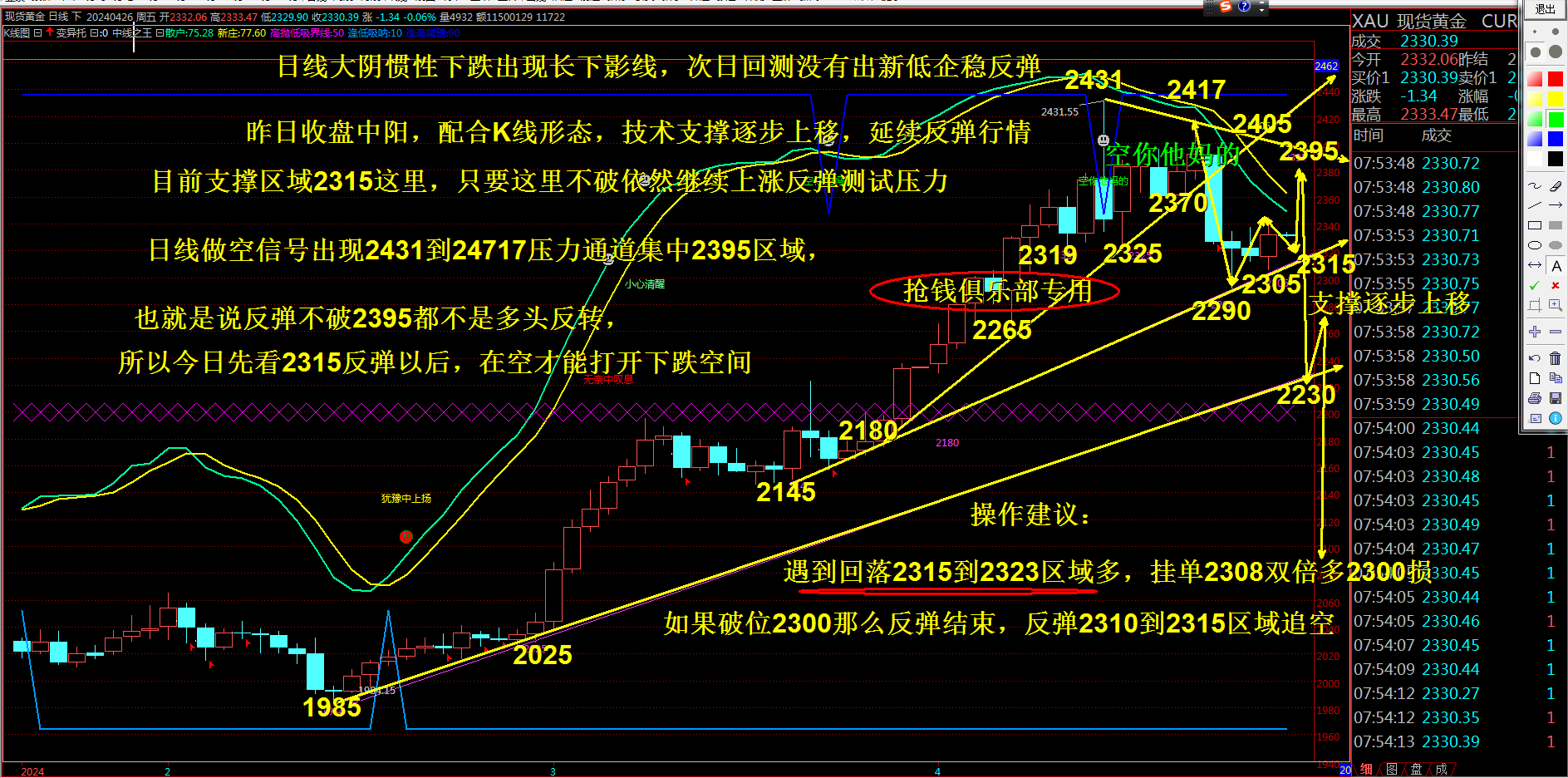 这个是黄金最近走势图,在2417下跌130美金以后出现技术反弹,一周也米有收盘2350上,甚至周线和月线都是出现颓势,这就是说明在历史高位多头持续买盘跟不上,那么你要做的就是不要去追多,同时最近所谓的数据行情,就是利空不跌,利多不涨,宽幅震荡,你如果真相信数据那么就是输了,你看数据严重失真,那么就是看看就行。如果你当真就输了,那群人天天盯着世界财富搜刮,他们不知道你关心的是什么,世界所有冲突最终为了财富分配,没有利益就没有争夺,到现在美联储没有带崩一些经济体,就开始货币转向显然不会的,最近你看频繁找我们的原因也即是如此。冲突演化的时间越久,那么矛盾越大,导致后果自然也是蔓延到自身。石油你看现在都没有以前上涨,当然新能源替代,也许说石油没有牛市,那么谁又能保证黄金不能替代?都是资本炒作的一个工具而已,当资本退去一地鸡毛,现在黄金的开采成本在1500美金一盎司,你说现在价格脱离商品属性会如何,就是这个点你做多黄金。那么大的波动,你如何稳定获利,现在牛都价格下跌一塌糊涂。 具体操作建议如下:
