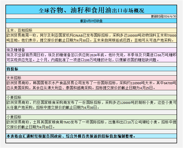 CBOT大豆Sv1下跌0.44%至每蒲式耳11.7650美元,玉米Cv1上涨1.99%至每蒲式耳4.48美元。