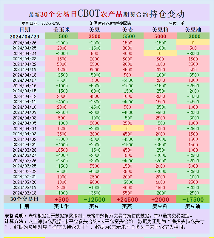 根据汇通财经观察,海外交易商估算的结果显示,本周一(4月29日),大宗商品基金增加CBOT美豆、美豆粕投机性净多头头寸、增加美玉米、美麦、美豆油投机性净空头。美豆粕未平仓多头与未平仓空头相同。最新30个交易日,大宗商品基金增加美麦、美玉米、美豆粕投机性净多头头寸,增加美豆、美豆油投机性净空头头寸。。