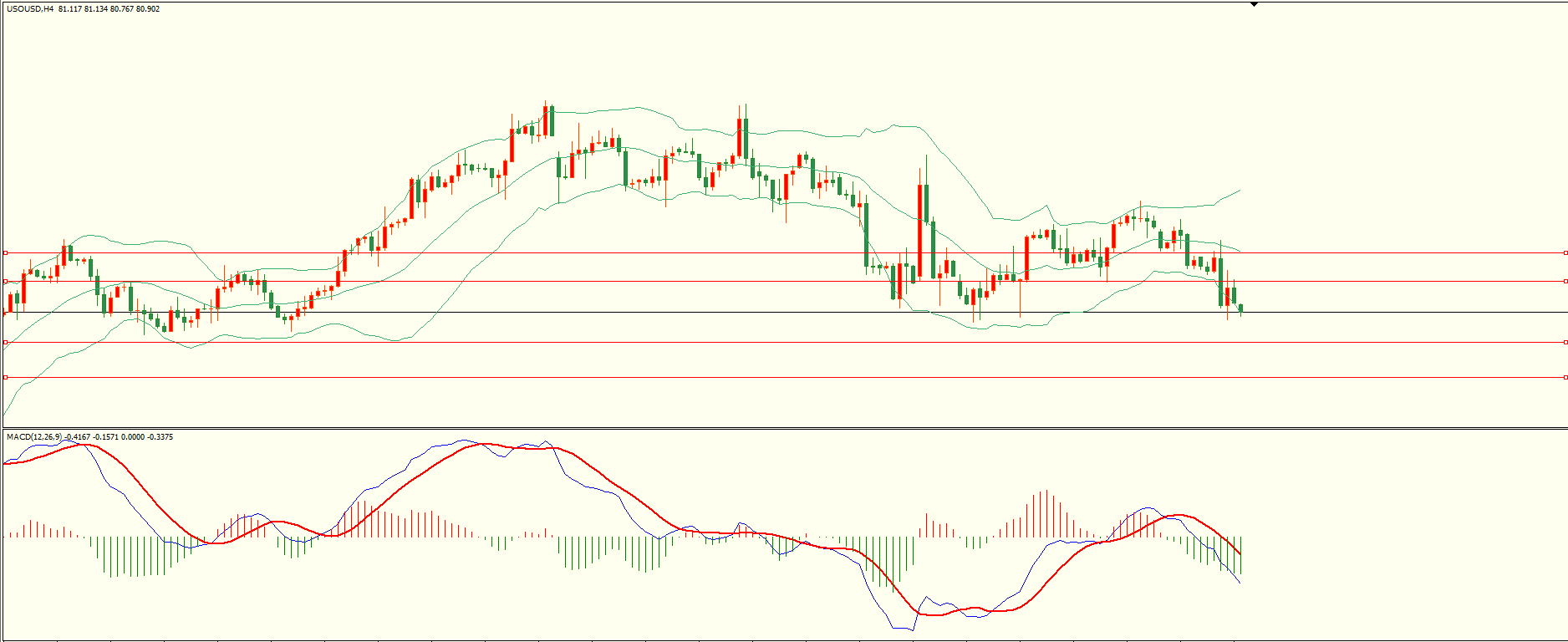 原油昨日反弹至第一阻力延续走低,纽约盘时段触及第一支撑略有缓和,日线报收上下影线中阴线,目前下方面临前低密集支撑区,失守后方可继续,从4H来看,布林上下轨扩张,MACD零轴附近运行,日内上方首要阻力81.70-80,第二阻力82.65,下方支撑80.00,78.95,保持在第一阻力下方短线有望测试第一支撑。