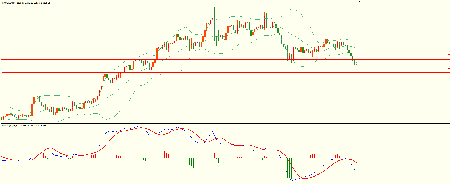 黄金昨日小幅调整后承压下行,盘中在利空因素打压下扩大跌幅,日线报收大阴线,从收盘来看,4H空头延续,目前下方紧邻日线前支撑,下破后方可打开下行空间,结合4H来看,布林上下轨扩张,MACD零轴下方运行,日内上方首要阻力2298-99,第二阻力2310,下方支撑2275-76,2265-66,第一阻力在没有收复前短线有望测试第一支撑。