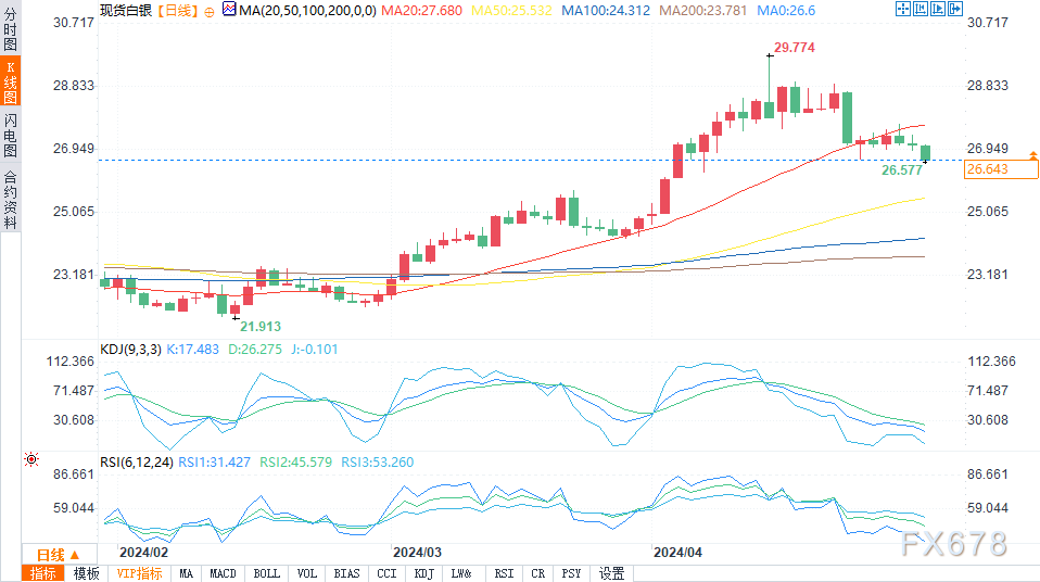 周二(4月30日)欧盘时段,白银延续前两日的跌势,下跌至日内低点26.638美元。美联储降息预期降低、美元走强以及全球风险前景改善,都对此次下跌起到了重要作用。