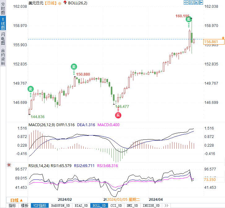 从技术分析角度来看,美元/日元在短线内有望突破周一创下的160.24多年高点。现汇在4月份成功突破了重要技术水准152.60,这是一个非常看涨的信号。交易员们正在密切关注更高的目标点位,如162.03、164.39、166.75,甚至174.37。日本央行可能会进一步干预。