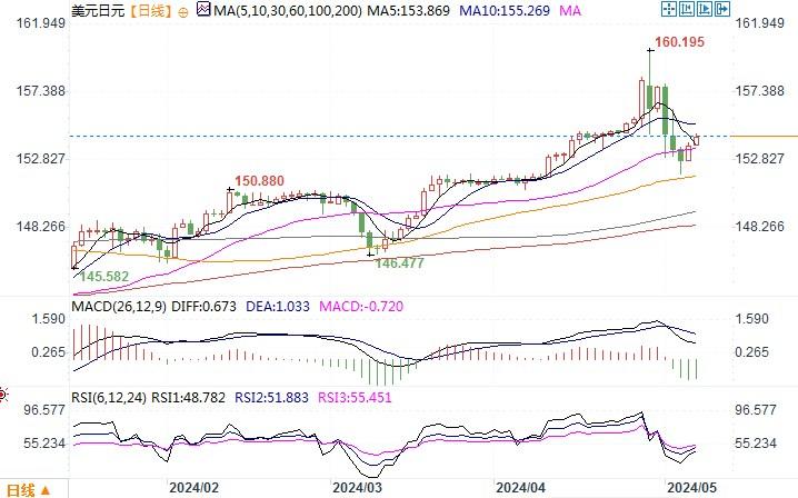 周一(5月6日),美元兑大多数货币连续第四个交易日下跌,而兑日元则在日本央行干预产生大幅回落之后出现空头回补性升高,当日美元/日元上涨0.61%,收盘于153.88。最近的美国劳动力市场数据和美联储官员的发言提振了降息希望。美联储主席鲍威尔上周三称加息仍不太可能,其他美联储官员周一也表示了同样的看法。纽约联储总裁威廉姆斯表示,美联储“最终”会降息,但他并未给出时间框架。里奇蒙联储总裁巴尔金表示,目前的指标利率水平应该能够为经济降温,从而推动通胀回到2%的目标水平。接下来,只要美国经济数据表现不那么强劲,且美联储其他官员不反驳鲍威尔不加息的观点,恐怕美元指数将会有进一步下滑的空间。上周日本央行实施大力干预,将日元从低点暂时脱离了出来。但是只要美联储没开始降息,而日元又仅保持在零利率水平,那么日元要想彻底扭转跌势似乎难度较高。日线图上,美元/日元短线在152附近获支撑进行着空头回补的回升之中,但整体仍受压于布林带通道中轨线之下,干预所形成的下降压力仍存。美元/日元是否会重拾升势,上方的关键看155能不能重新被冲破,若破位则有望继续向上探测。若短线的空头回补性回升遇阻于155附近,后市恐怕在忌惮干预的心理影响之下,美元/日元预料会产生进一步的回落行情。