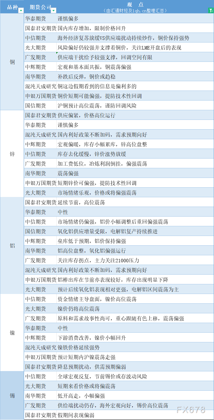 期货公司观点汇总一张图:5月7日有色系(铜、锌、铝、镍、锡等)