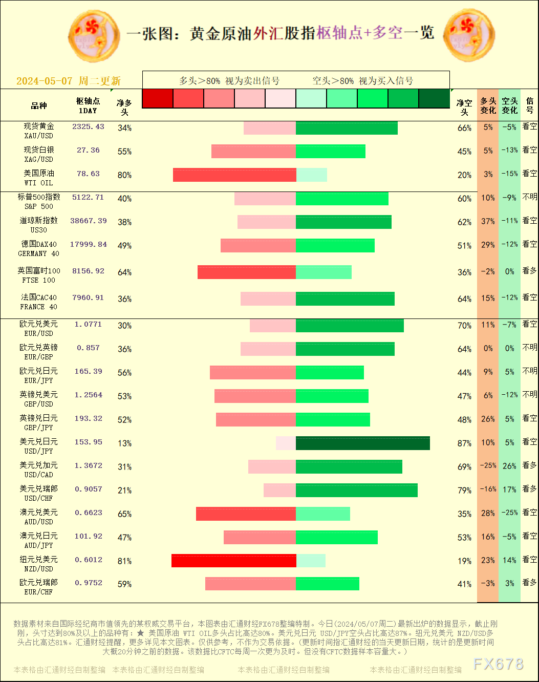 一张图:黄金原油外汇股指"枢纽点+多空占比"一览。今日(2024/05/07周二)最新出炉的数据显示,截止刚刚,头寸达到80%及以上的品种有:★ 美国原油 WTI OIL多头占比高达80%。美元兑日元 USD/JPY空头占比高达87%。纽元兑美元 NZD/USD多头占比高达81%。汇通财经提醒,更多详见本文图表。仅供参考,不作为交易依据。