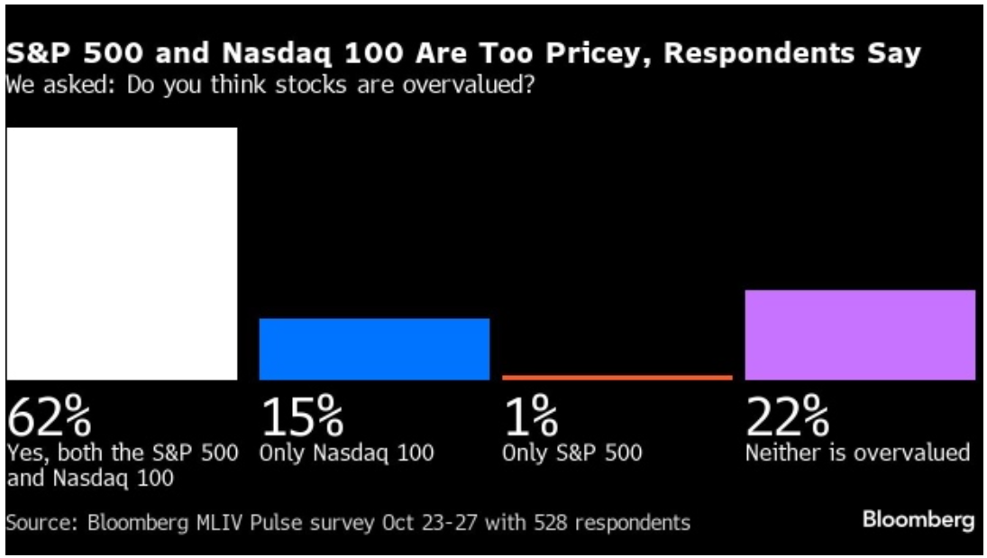 针对10年期美国国债,调查参与者并不指望压力会减轻。调查中的受访者中位数预测认为,该期限的收益率可能会在年底时达到5%。超过60%的调查参参与者认为标普500指数和纳斯达克100指数都被高估了,而约15%的人认为科技股的估值才是被夸大的。