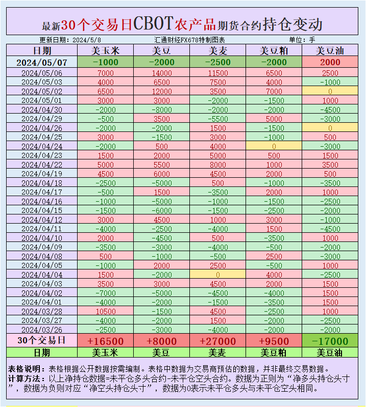 根据汇通财经观察,海外交易商估算的结果显示,本周二(5月7日),大宗商品基金增加CBOT美豆、美玉米、美麦、美豆粕投机性净空头头寸,增加美豆油投机性净多头头寸。最新30个交易日,大宗商品基金增加美豆、美豆粕、美麦、美玉米投机性净多头头寸,增加美豆油投机性净空头头寸。