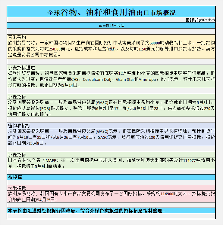 截至周二收盘,全球谷物、油籽和食用油出口市场招标、采购概况: