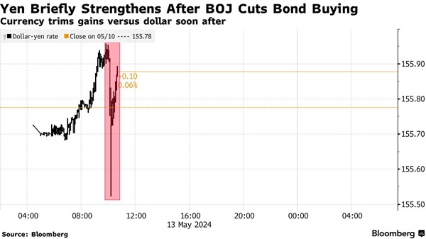 日本央行周一(5月13日)宣布,与4月24日相比,该央行将在常规操作中购买更小规模的政府债券,以寻求减少其在日本债券市场的存在。受该消息影响,美元/日元短线跳水逾40点至155.49附近。