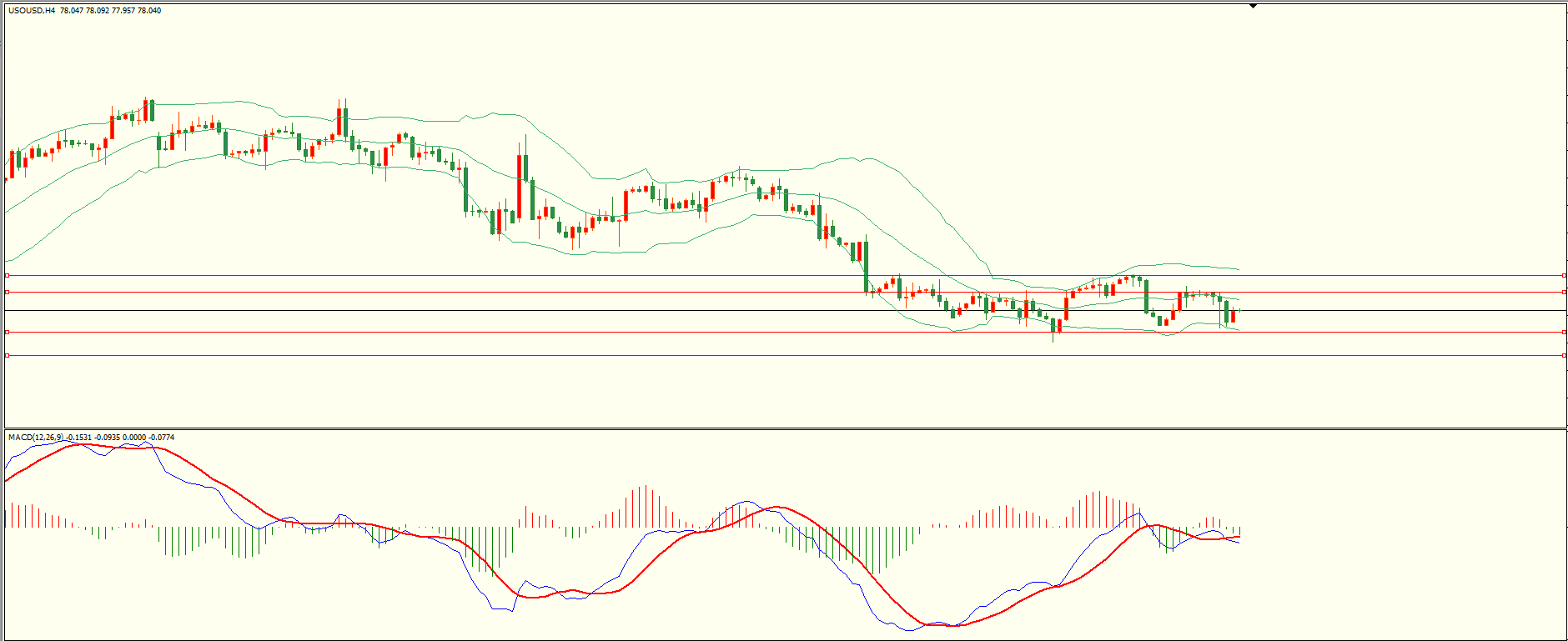 原油昨日亚市开盘后震荡下行,盘中回落至第二支撑附近展开反弹,日线报收上下影线小阴线,目前下方紧邻前低密集支撑区,下破后方可继续,从4H来看,布林中轨拐头向下,MACD零轴下方运行,日内上方首要阻力78.70-80,第二阻力79.50,下方支撑77.10,76.10-20,保持在第一阻力下方短线有望测试第一支撑。