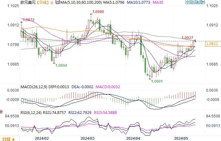北京时间5月15日12:57,欧元兑美元报1.0822/22