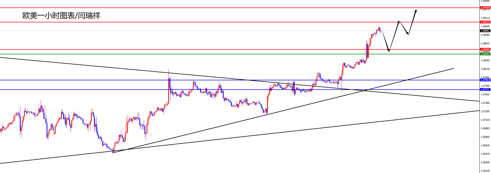 欧美方面,周三欧美价格总体呈现上涨的状态。当日价格最低下跌至1.0812位置,最高上涨至1.0885位置,收盘于1.0883位置。回顾周三欧美市场表现,早间开盘后价格短线震荡再度上行并突破前一日高点位置,随后价格持续上攻,市场正如笔者所言一路拉升,日线级别大阳收尾,后续整体继续关注上行,短线上暂时关注四小时支撑1.0840-50区间支撑,上方关注1.0900-1.0930区域。
