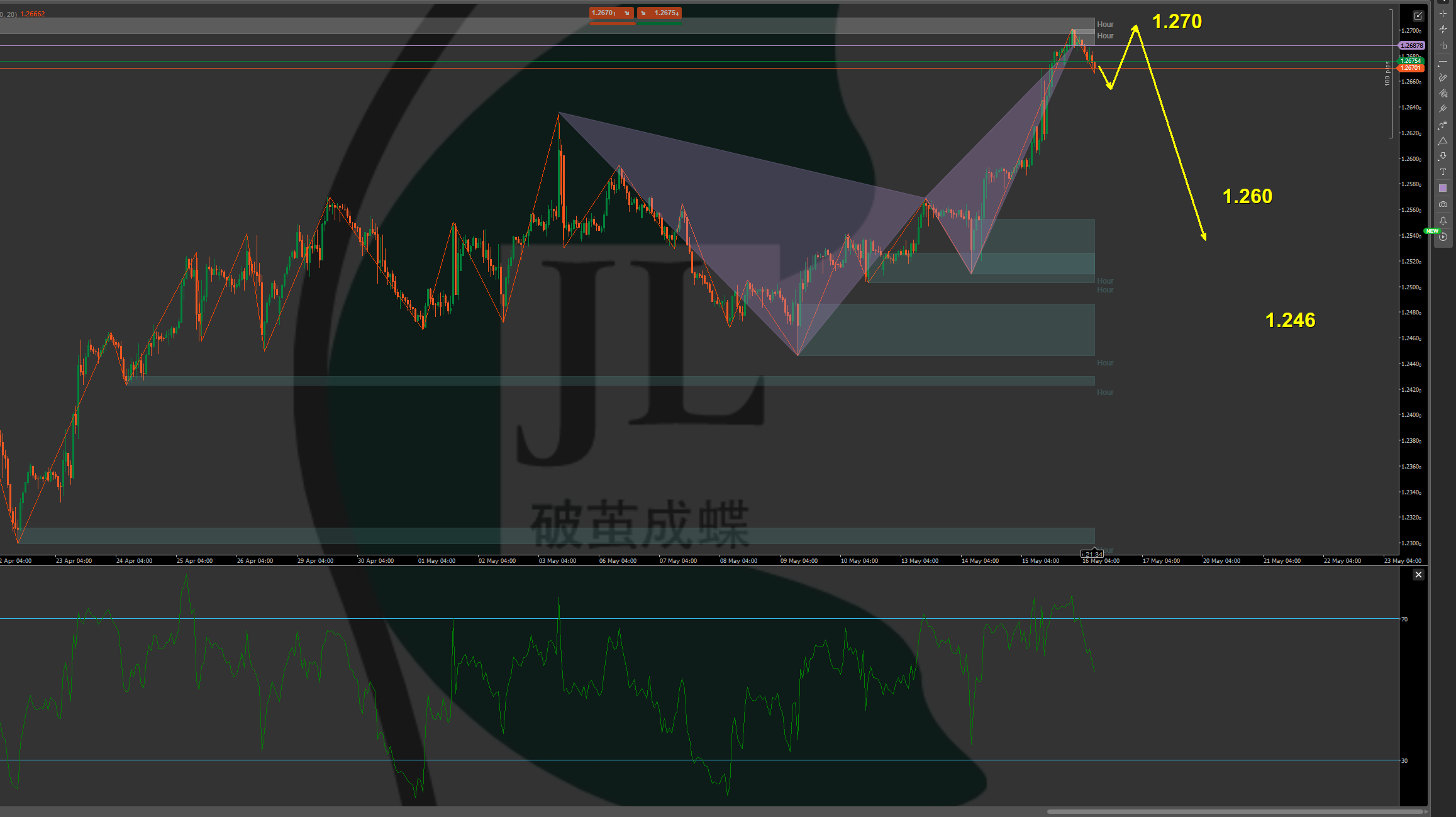 所以说对于后市英镑兑美元的走势上,如果价格再次给到1.270我就要看跌了。这个下跌从RSI指标来看也是处于超买区,并且开始出现背离走势。这样的价格变化来看显然也是支持看跌的。所以后续我关注的交易机会就是1.270的压力。