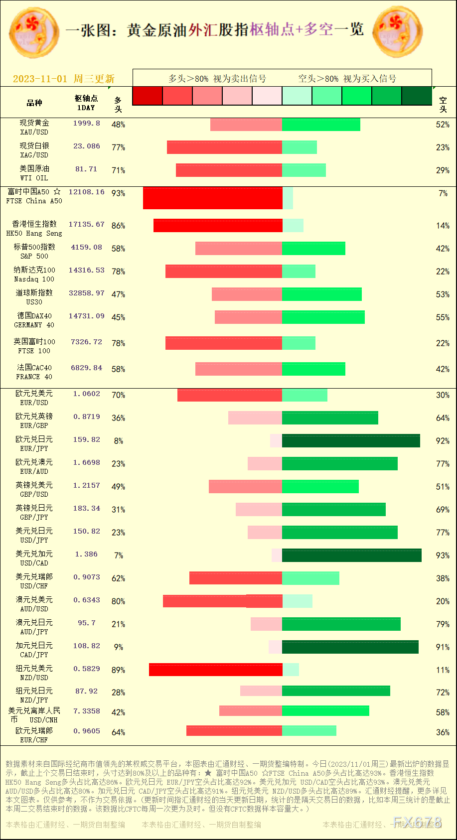 一张图:黄金原油外汇股指"枢纽点+多空占比"一览。今日(2023/11/01周三)最新出炉的数据显示,截止上个交易日结束时,头寸达到80%及以上的品种有:★ 富时中国A50 ☆FTSE China A50多头占比高达93%。香港恒生指数 HK50 Hang Seng多头占比高达86%。欧元兑日元 EUR/JPY空头占比高达92%。美元兑加元 USD/CAD空头占比高达93%。澳元兑美元 AUD/USD多头占比高达80%。加元兑日元 CAD/JPY空头占比高达91%。纽元兑美元 NZD/USD多头占比高达89%。汇通财经提醒,更多详见本文图表。仅供参考,不作为交易依据。